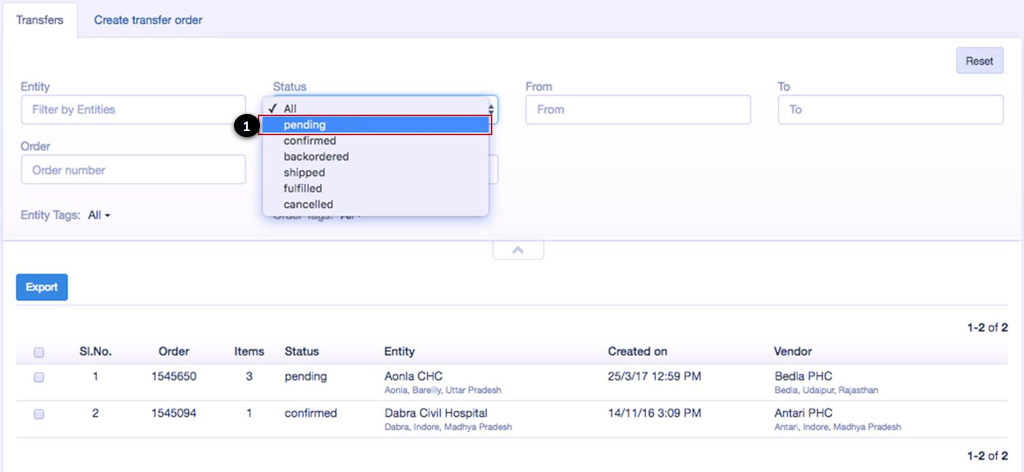 2. View a list of transfer orders with the selected status