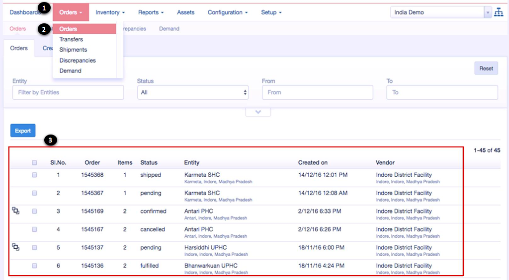 View a list of all orders across entities and select an order, either by searching in the list OR by using available filters