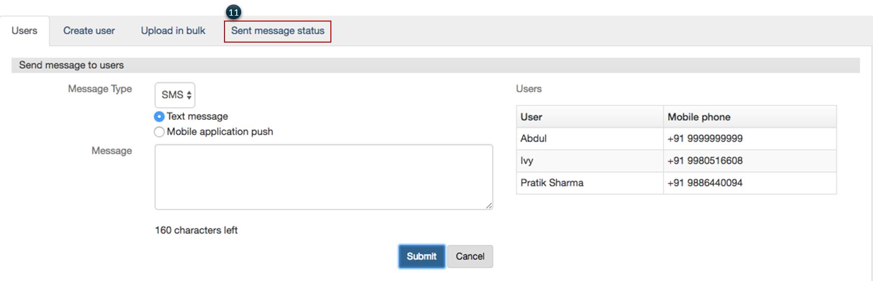 5. On the right of the message screen, you can view the Users names and the mobile numbers to which the message will be sent